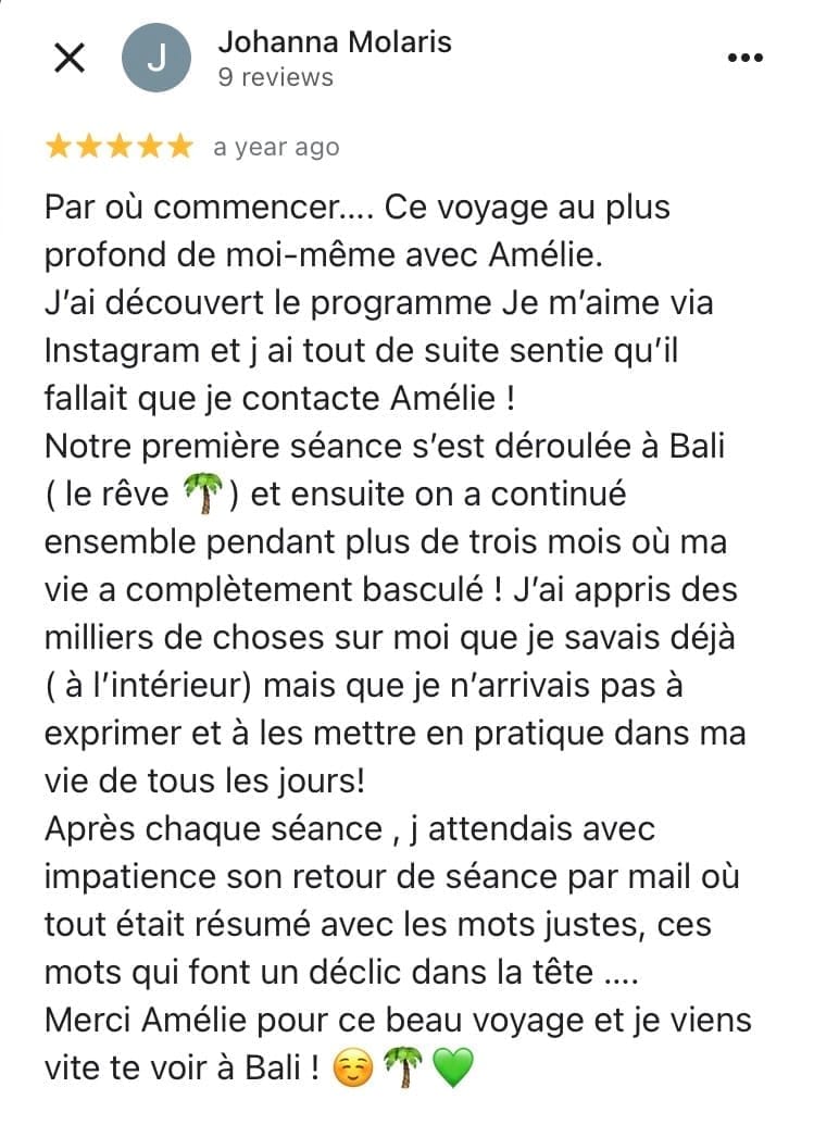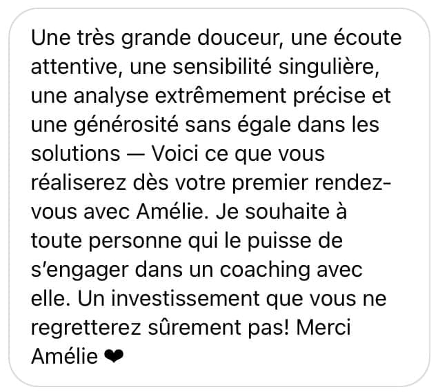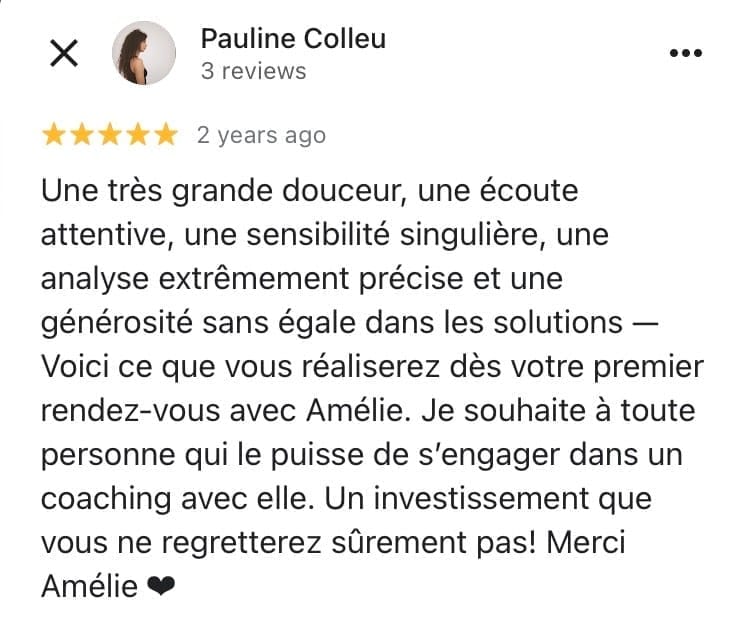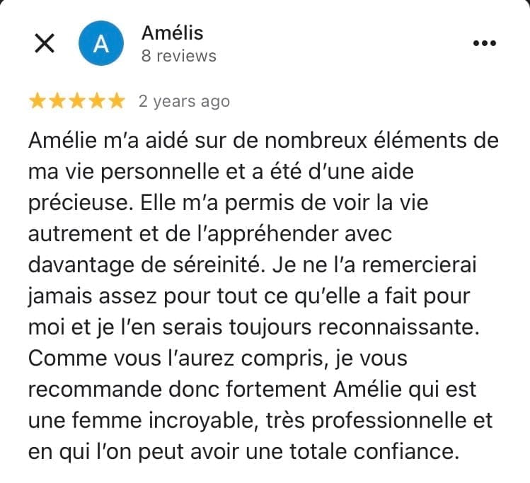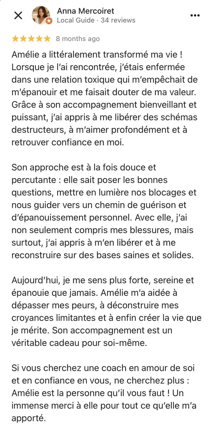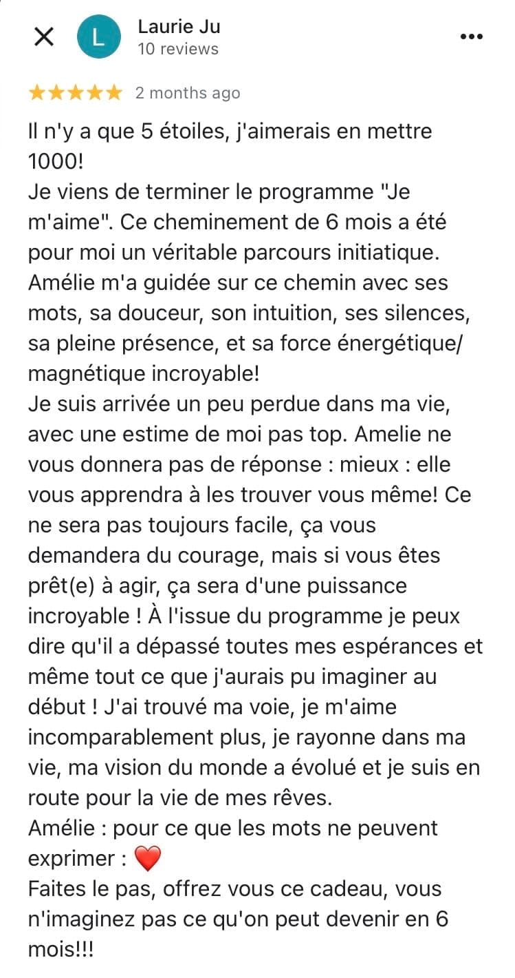 Je m’appelle Amélie, je suis Love Coach diplômée et créatrice de la Love Life Academy. J'ai accompagné plus de 400 femmes vers l’amour de soi, la sécurité émotionnelle et des relations saines. Mon approche est humaine, profonde et douce. Je t’emmène là où tu n’as jamais osé aller, pour devenir la femme que tu es déjà.